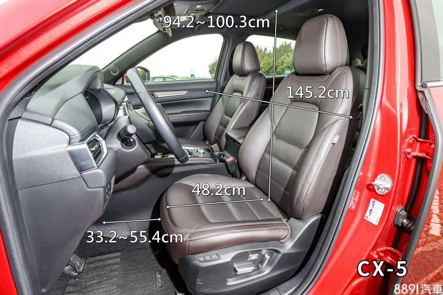 頂規CX-5前座均提供適合國內環境的通風功能,駕駛座有8向電動調整、電動腰靠和兩組記憶功能,副駕駛座則是只有單純的6向電動調整,功能性比起NX200豐富,而且Nappa真皮的質感也細膩得多,至於坐感也是偏軟,舒適表現不遜於NX200,腰部的包覆性還更好一些 。