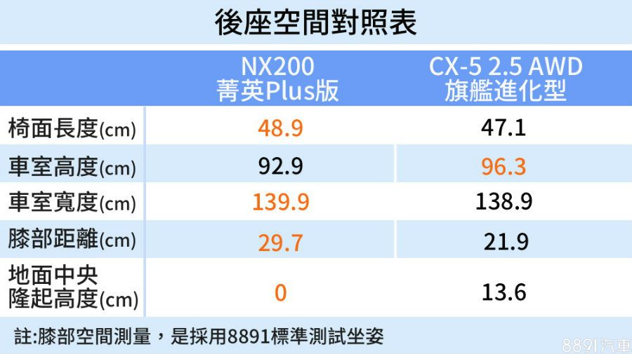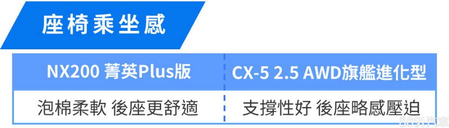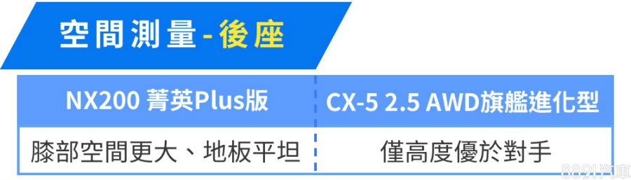 兩車在前座的量測數據差距微小,但後座部分則明顯是NX200勝出,膝部空間比CX-5更寬裕,加上完全平坦的地板造型,提供乘客更多的腿部伸展範圍,反觀CX-5,就算面對非豪華品牌的對手,空間表現向來也處於弱勢,這回則依然不敵NX200。