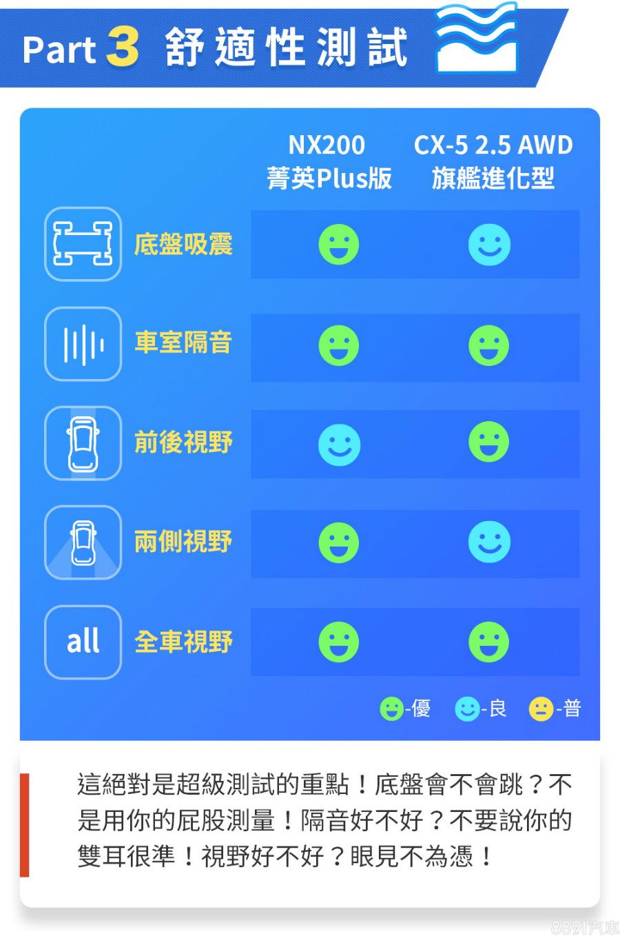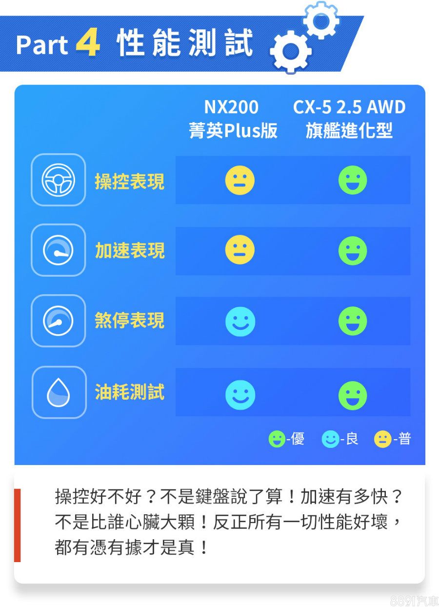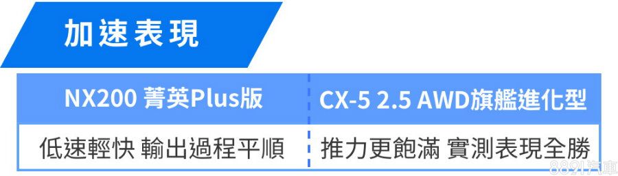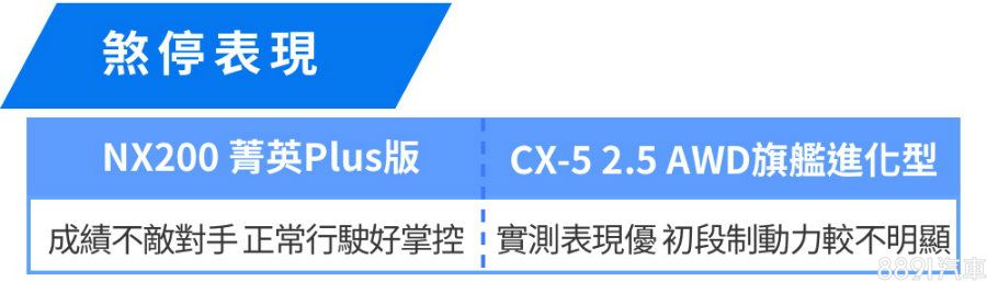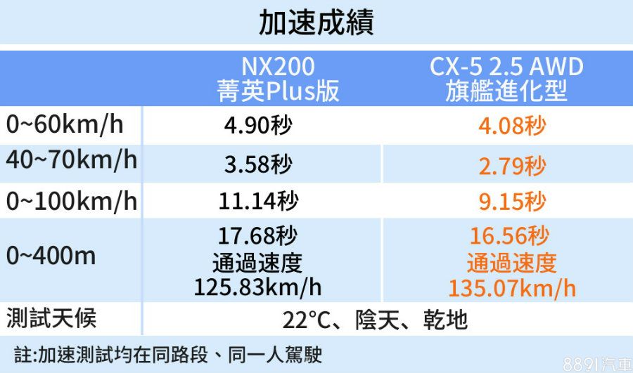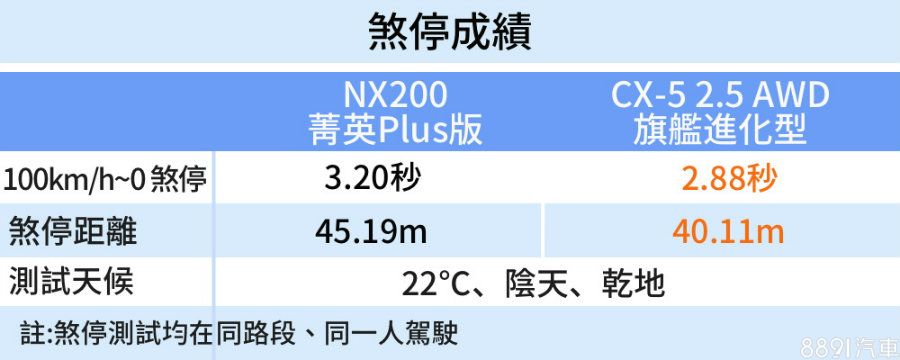 CX-5在同場的加速實測全盤勝出,畢竟都是NA引擎的架構,多出的那500c.c.就是換取動力的基礎,拿下這一局理所當然,NX200數據表現也不至於難看,大概就比1.8自然進氣的Altis再慢一些,算是合理成績。