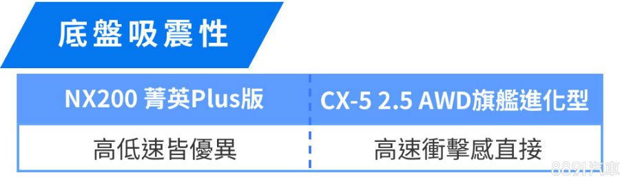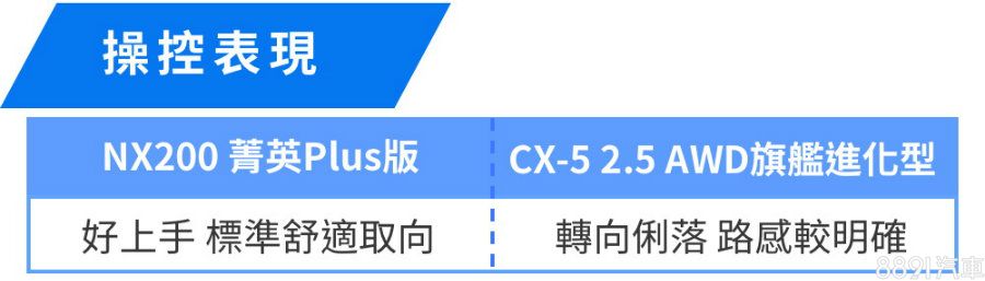 另一方面,CX-5避震器阻尼也明顯比NX200硬一些,雖然未到性能化等級,但運動性就是高於NX200,彎中可以提供較好的支撐性,回饋感也較為明顯,至於AWD四驅系統,由於CX-5 2.5動力稱不上高性能(縱使比NX200大一截),因此在多數狀況下,後輪分攤動力輸出的優勢並不明顯,若碰到超出前輪負荷的狀況,才會顯現AWD的優勢。