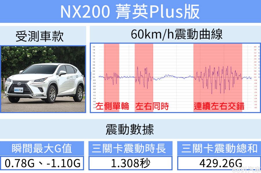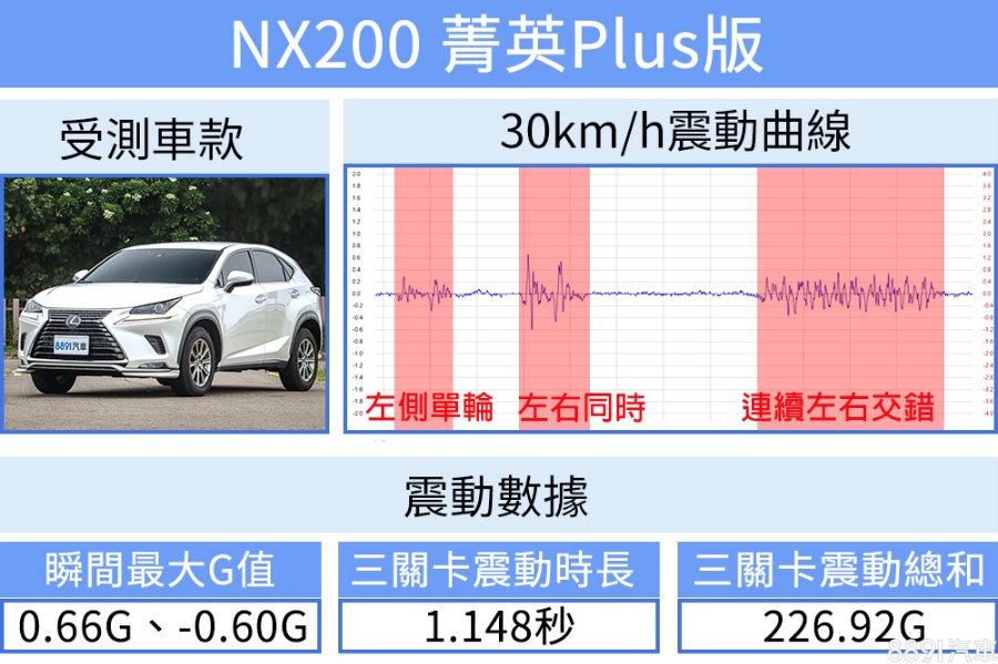 相比低速關卡的優異表現,NX200在時速60km/h震動關卡增加的G力總和仍屬合理範圍,數據仍優於CX-5,除了左右同時的部分有一些車體晃動的情形,從震動曲線的整體走向來看還算工整,連續左右交錯顯現出後半段開始回穩,實際體感也有出色的舒適性。