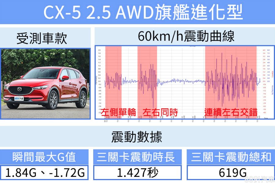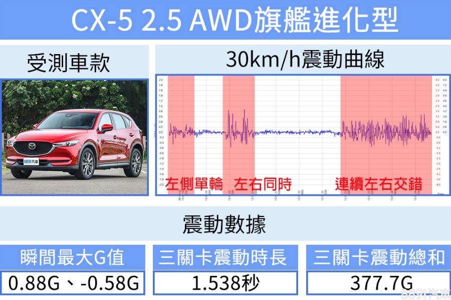 CX-5的瞬間最大G值達到1.84G,震動總和也明顯比NX200高了不少,從曲線來看,三個關卡的上下振幅顯得比較大,傳到車內的震動感也比NX200強烈,以結果而言,兩車的底盤設定調性存在確實差異。