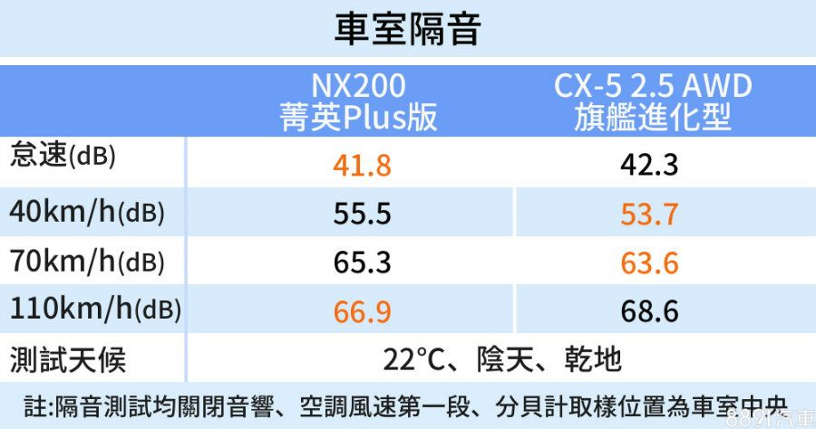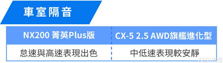 兩車在隔音性的實測中互有高低,NX200怠速狀態的靜肅性優異,CX-5也不錯,但傳進車內的引擎聲略多些許,而40km/h與70km/h巡航下,CX-5的底盤隔音水準比NX200更好,至於在110km/h狀態,反倒是NX200對於風切聲抑制比CX-5處理得更好,互有勝負。