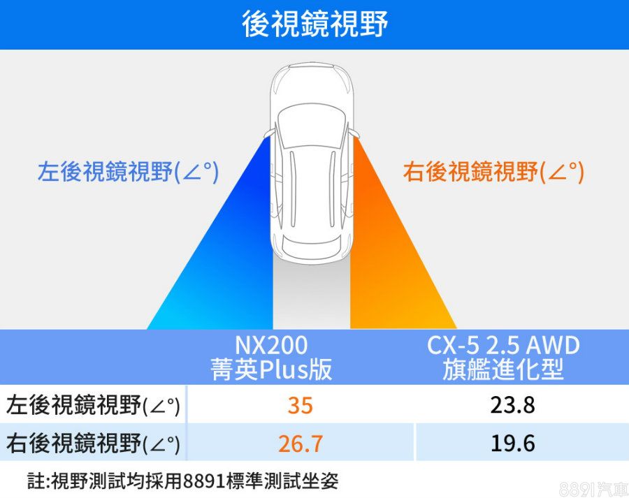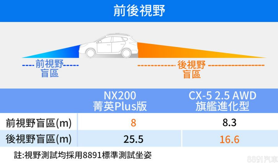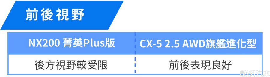 雙方在前視野表現差不多,NX200則因上揚的車尾線條,加上尾窗面積較小,讓後方的盲區距離比CX-5多了約9m。
