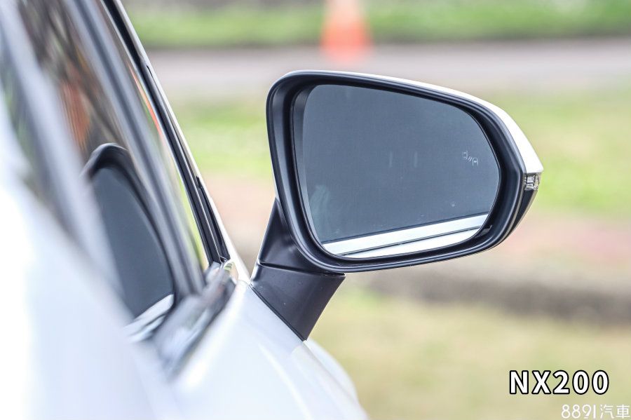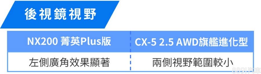 NX200後視鏡造型較向外延伸,且左側帶有廣角鏡設計,兩側可視角度皆大幅勝過CX-5。兩車皆配備盲點偵測系統,確保視線死角的安全。