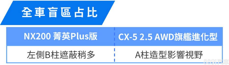 兩車盲區占比相當,在同車型數據中屬後段班水準,而CX-5則因A柱造型較粗壯,兩側A柱遮蔽範圍都偏大,使其在視野表現中遜於NX200。