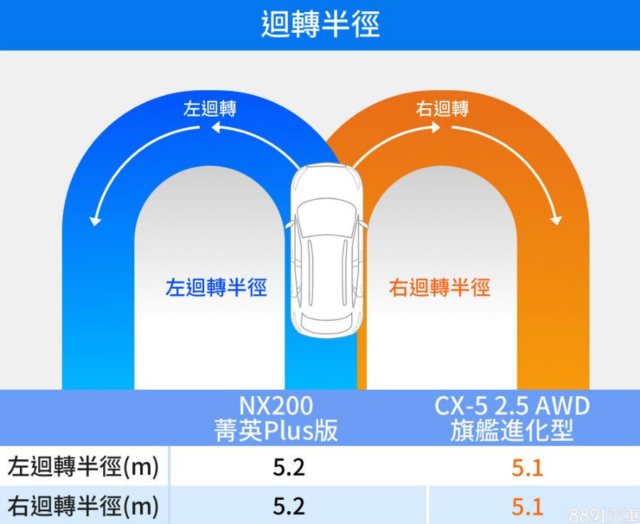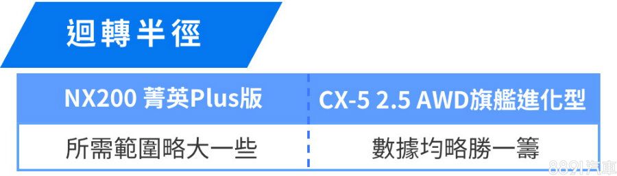 兩車實測迴轉半徑相仿,左右數據都落在5m左右,為中型休旅級距水準,至於CX-5即便數據少0.1m,實際開起來差異並不明顯。