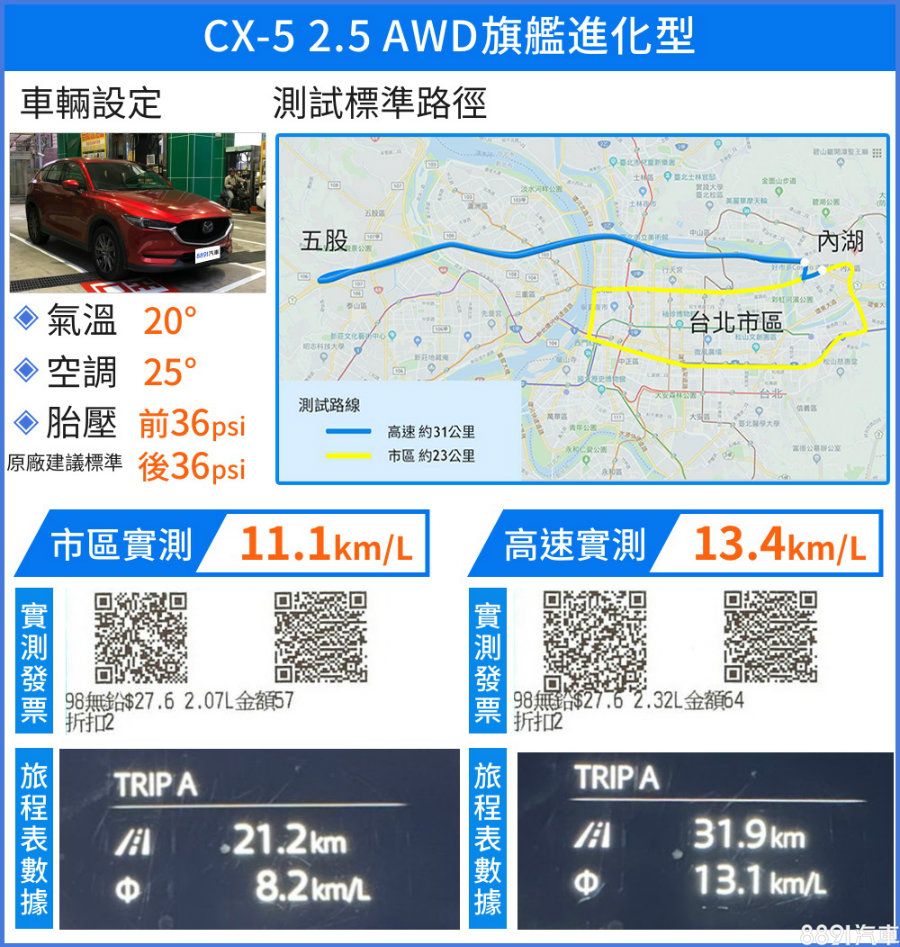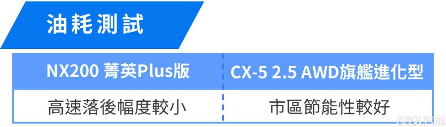 CX-5採用四輪傳動系統,也不像NX有Eco模式、怠速熄火功能,以條件來看並不具省油優勢,但仰賴四驅系統比例分配,在巡航時能以前輪驅動為主,進而達到省油目的,且車重也更輕,實測下來市區11.1km/L明顯勝過NX,高速表現則是打平,不論性能、節能都有優異表現。