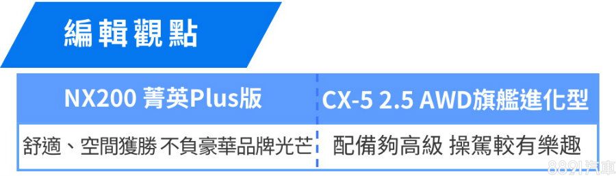 至於CX-5則是性能表現相對出色,加速、煞停成績一面倒勝出,操控也相對俐落、直接,雖然在舒適性上不如NX200,但反而多了些駕駛樂趣。至於CX-5夠不夠豪華?仰賴頂規版本的身分,配備豐富度甚至比中階NX200更上一層,車室鋪陳的質感稱作高級不為過,在便宜近對手30萬的前提下,CX-5是平民品牌中的「準豪華車」無誤!