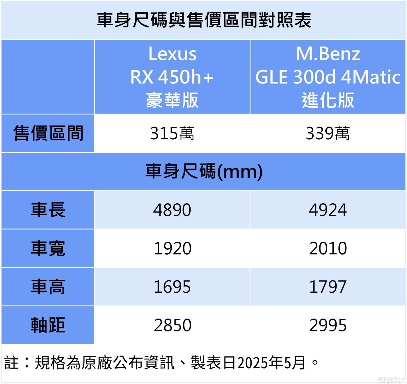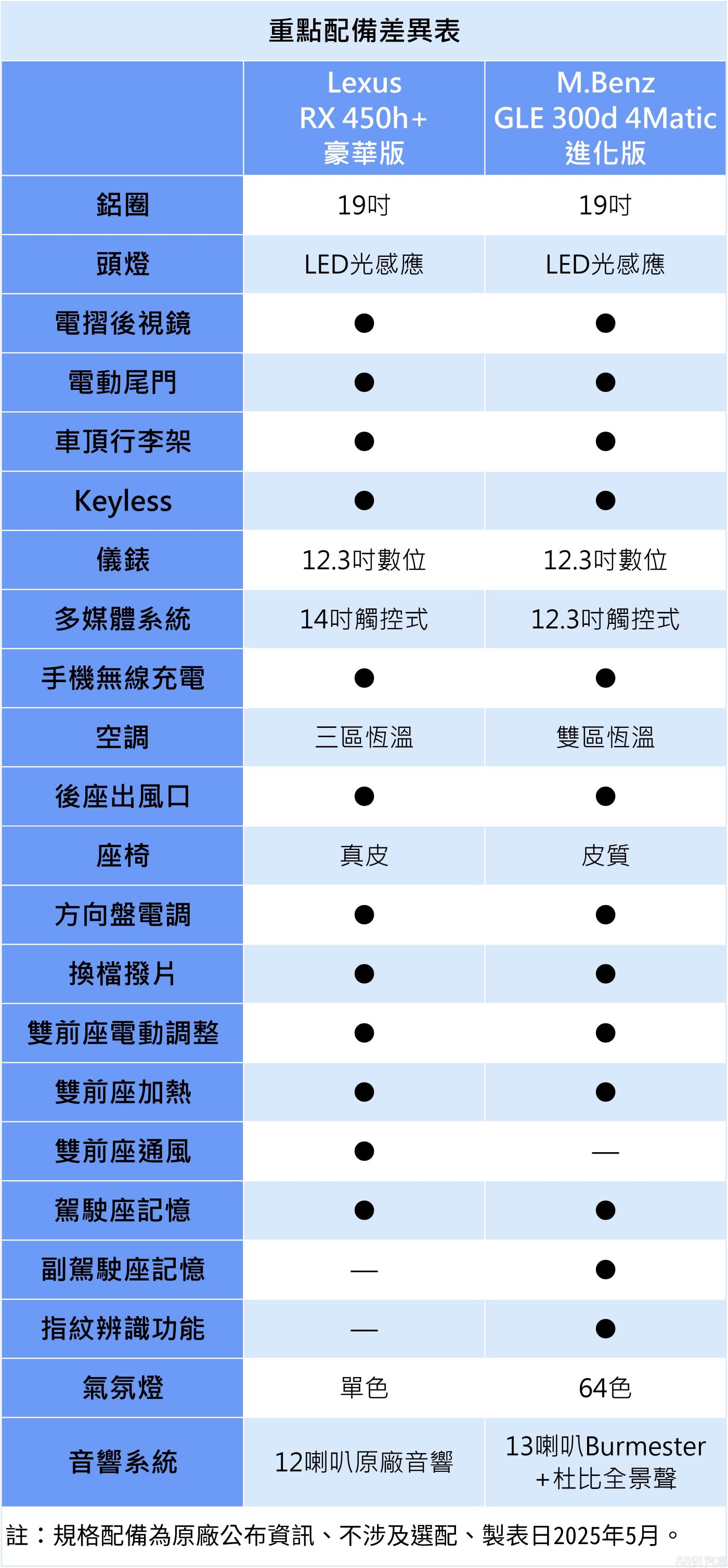 在國內大型豪華SUV級距,Lexus RX靠著較低的入手門檻、多元動力,廣納消費客群,成為市場銷售Top 1,賓士GLE雖然定價比同級略高,但仗著「三芒星」的品牌信仰依舊繳出不俗成績。這次抓300萬的預算,從兩車尺碼、動力、配備到安全列表比較,看看RX 450h+豪華版便宜大碗?還是GLE 300d 4Matic進化版貴有所值?<想知道你問到的價格合不合理?立即查詢車主成交價 >