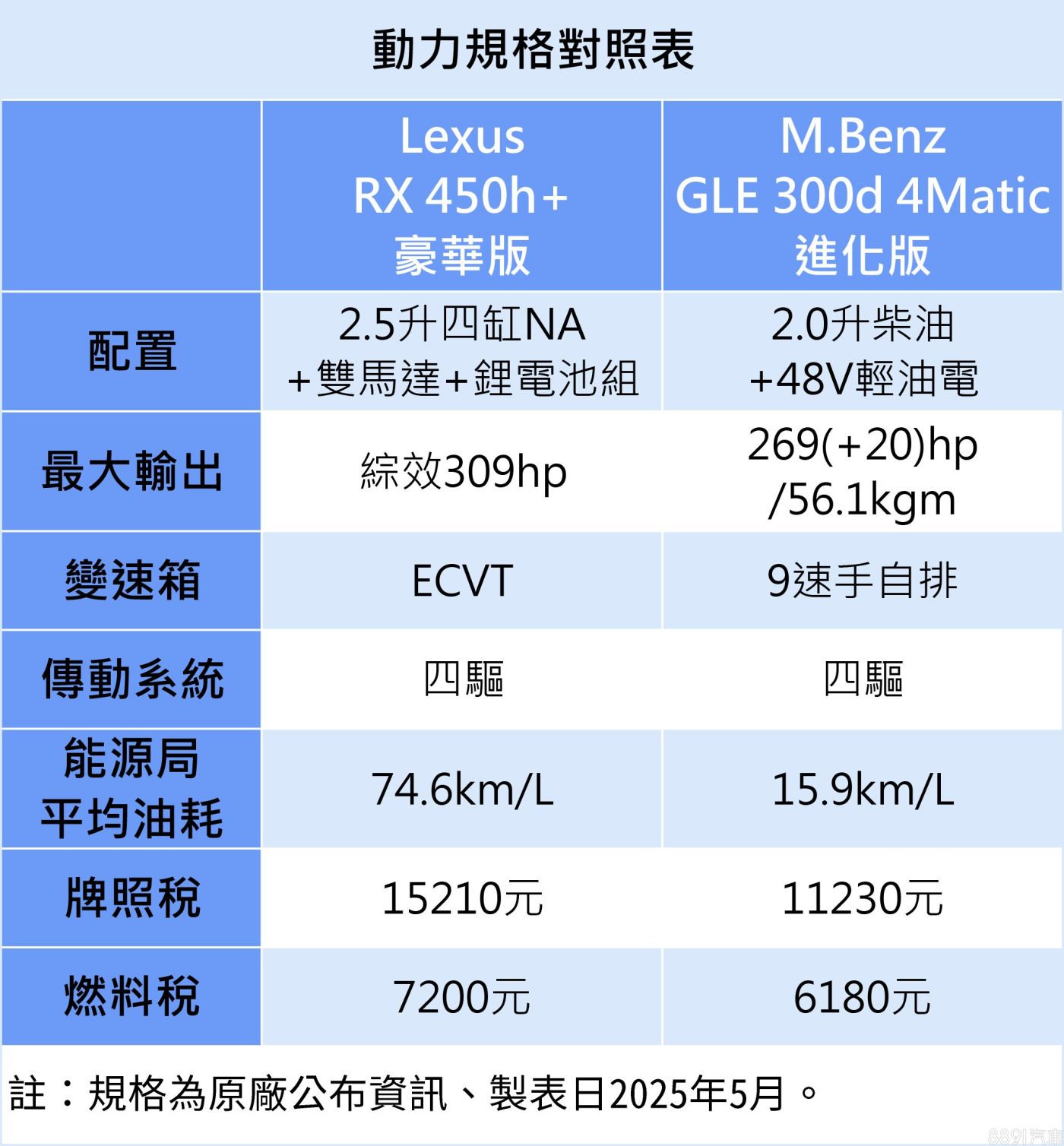 兩車動力配置差異頗大,RX 450h+是以2.5升NA+雙馬達+鋰電池組建構成PHEV油電系統,綜效最大馬力309hp,滿電時具備81km純電行駛里程,繳出74.6km/L的漂亮油耗,若是善用AC交流慢充,確實能省下大筆油錢;至於GLE 300d 4Matic則是搭載2.0升柴油渦輪+48V輕油電的組合,帳面數據雖不比對手,但每年稅金便宜一些。