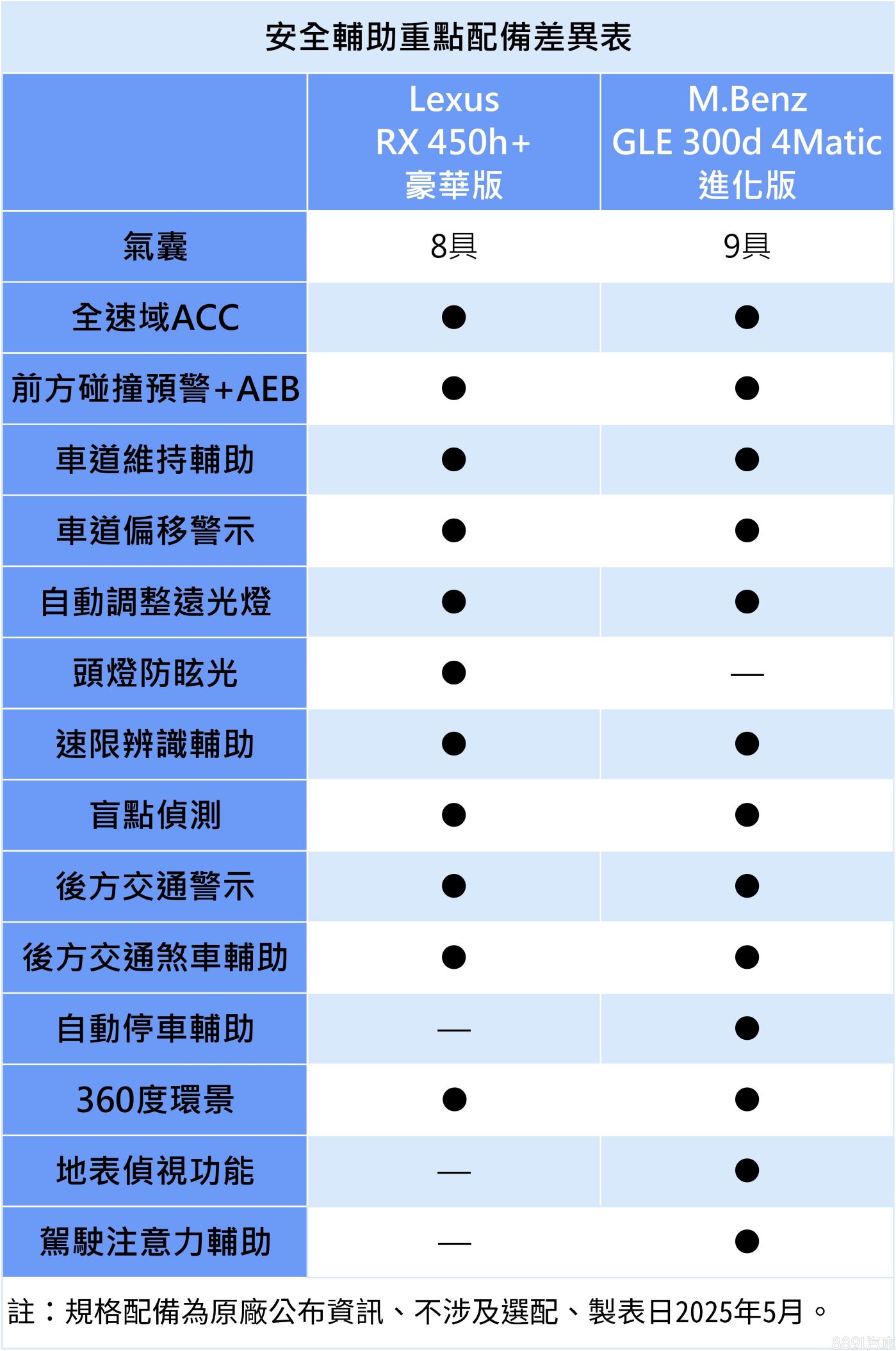 Level 2跟車、AEB、盲點偵測、後方交通警示與防撞輔助,這些符合市場趨勢的安全配備都沒漏。RX搭載AHS智慧頭燈,具備遠光燈自動遮蔽功能,能避免對他人造成眩光;GLE則是贏在配備「懶人救星」的主動停車輔助,360度環景支援地表偵視,遇到需要越野的爛路能派上用場。