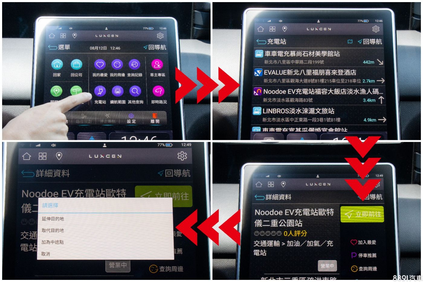 只要設置好導航目的地,點取充電站,就能看到沿途、周邊與目的地附近有的站點,點選「立即前往」,就能加為中途點啦!