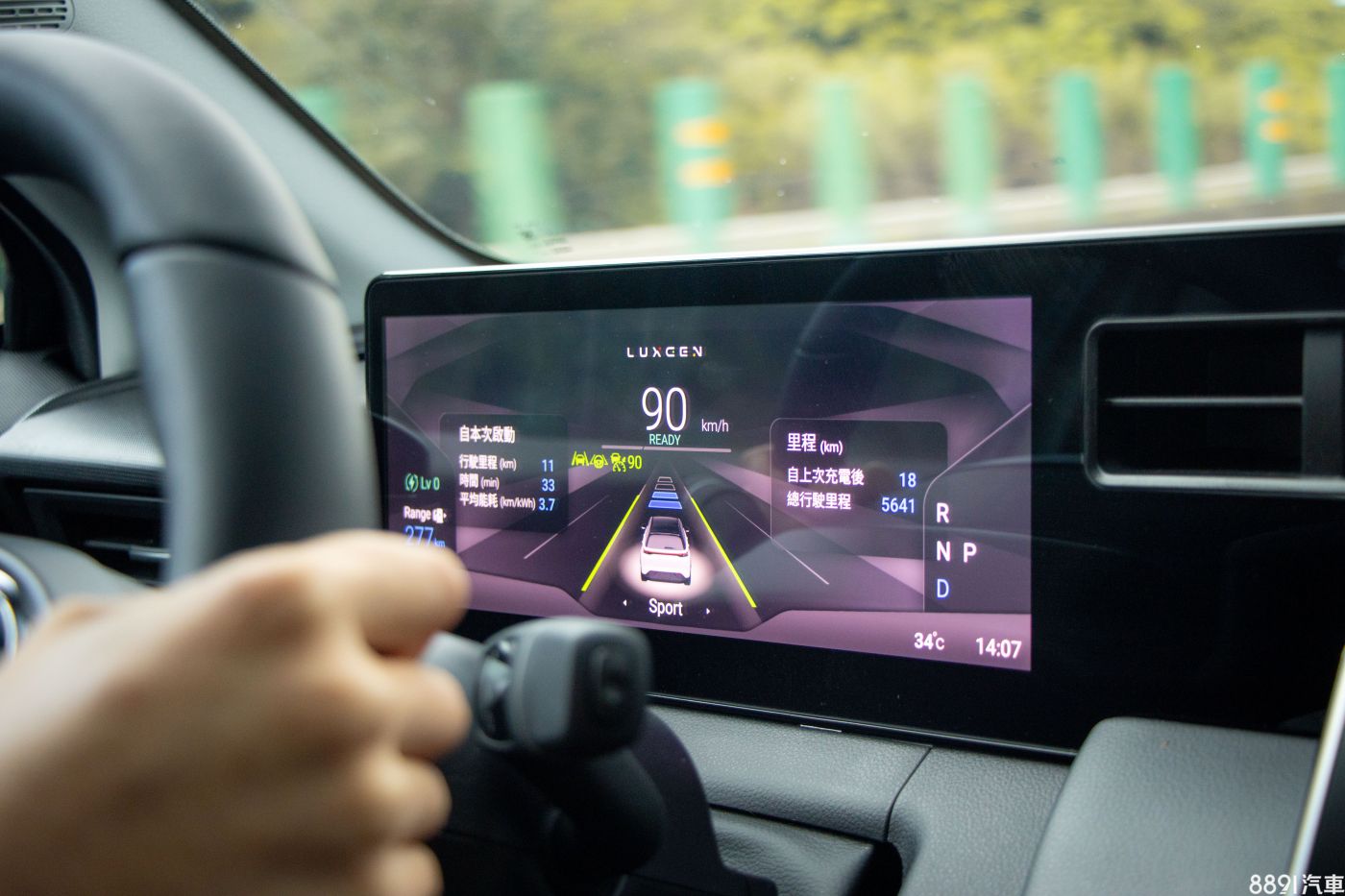 出發啦!採單馬達後驅設定的n⁷,出力231hp/34.7kgm,對我這種開穩不開快的駕駛來說,已綽綽有餘,而且電門與煞車好掌握,輸出也相當線性,動能回充段數由方向盤兩側下方按鍵進行操作,共有Lv 0~4共5段可調,長按左側按鈕則可切換至單踏板加減速模式,不過顧慮我沒有「黃金右腳」,以及小孩乘坐的舒適度,我通常設定在Lv 3以下。