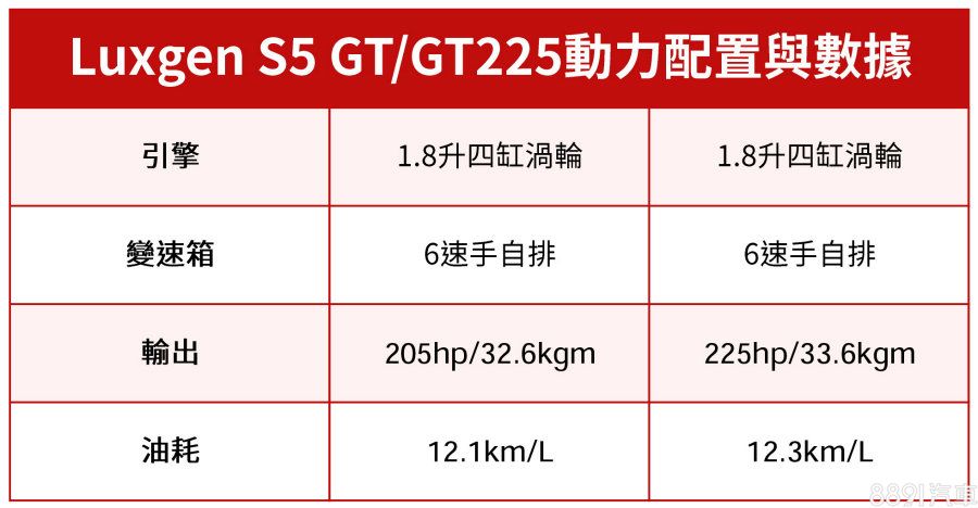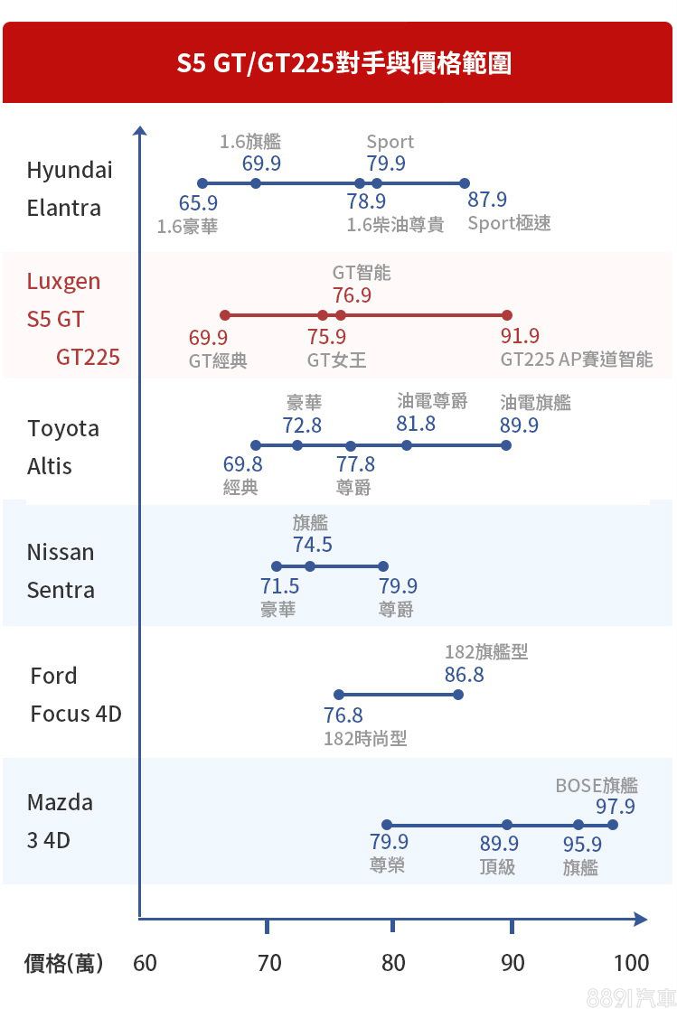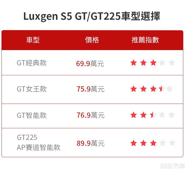 Luxgen S5 GT/GT225車系提供4車型選擇,S5 GT還是偏向傳統大眾化口味多點,各車型價格也與諸多國產中型房車相去不遠,S5 GT225則是明擺著要走「性能房車」路線,與GT頂規版本價差達13萬元。