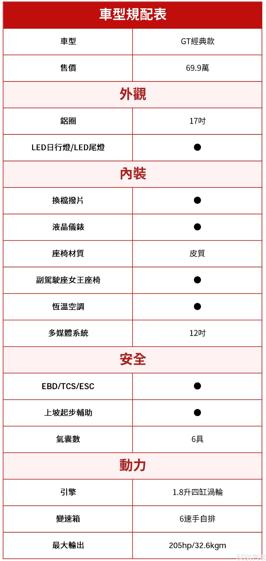 GT經典款的標準配備已屬十分完善,先不談1.8升渦輪動力應付日常所需肯定綽綽有餘,原廠也特地針對先前被嘴換檔不夠順暢的6速手自排變速箱進行優化,而6氣囊、改款重點之一的12吋多媒體系統、恆溫空調都頗有誠意,以入門版本來說,GT經典款算是經濟取向擺第一的優質選項。