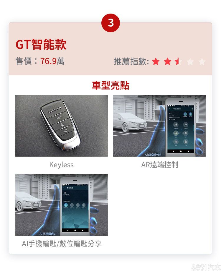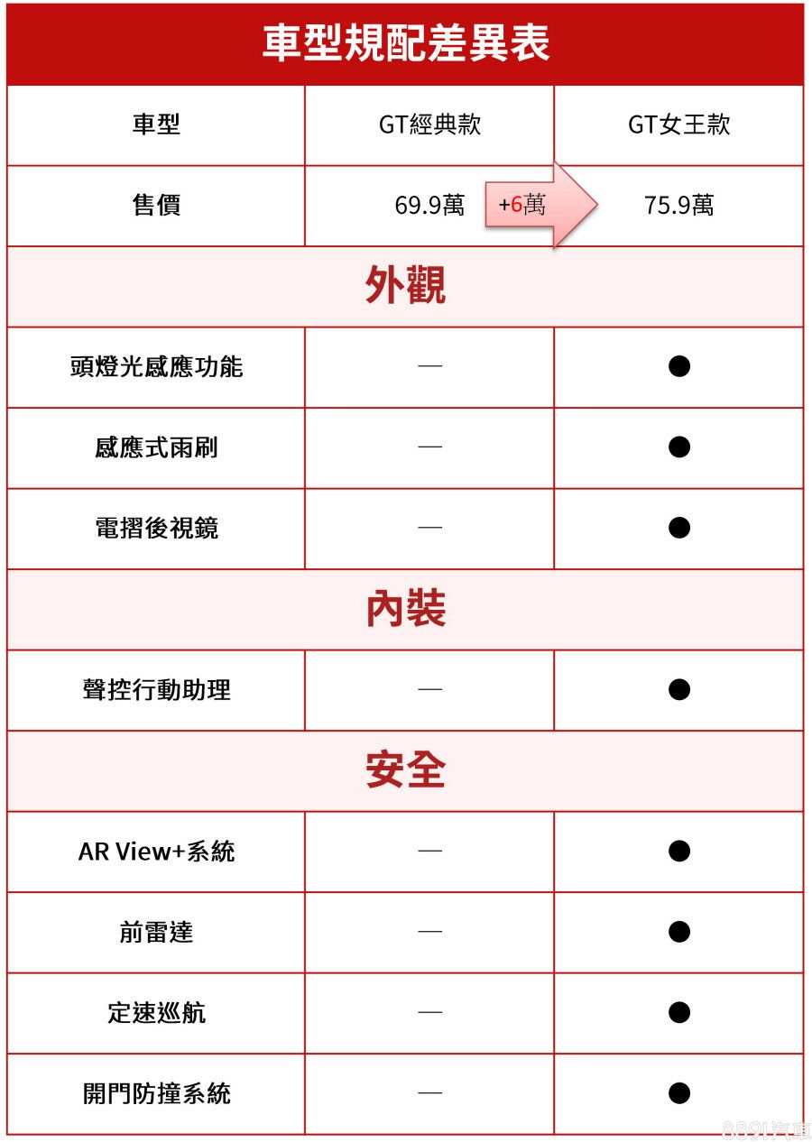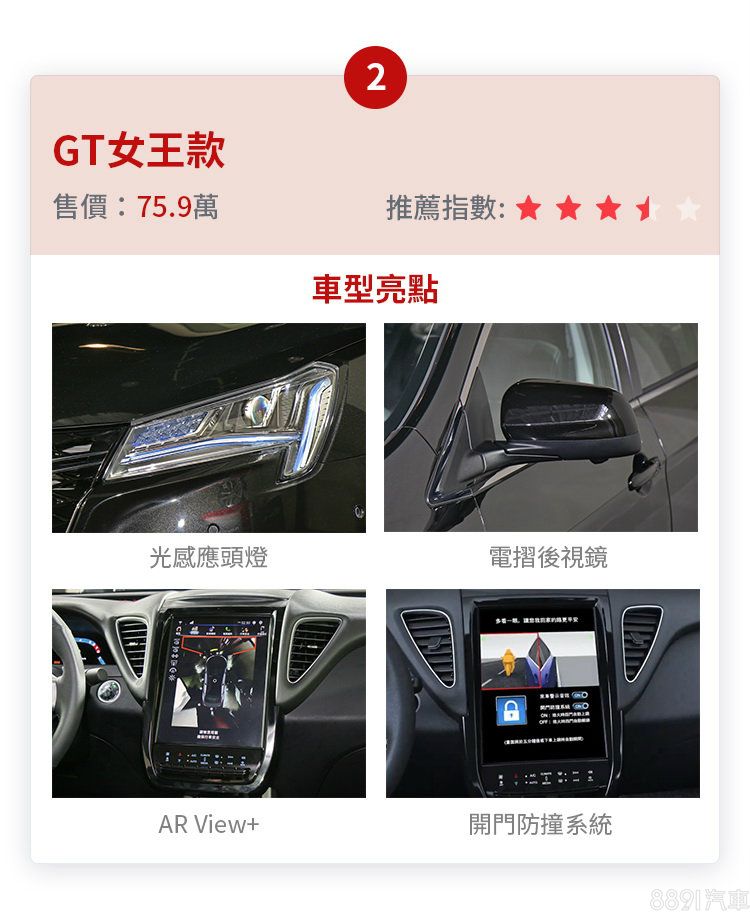 加6萬到了二階的GT女王款,主要追加了不少便利性配備,不過推薦指數高於入門的原因不是因為方便,而是整合在AR View+系統裡面的無盲點車側影像、後視Live影像等,有助於提升行車安全的配備,畢竟盲區本就是駕駛視線死角,加上S5 GT/GT225的前後視野盲區表現並沒有特別突出(詳情可見S5 GT225超級測試),老話一句「安全無價」。
