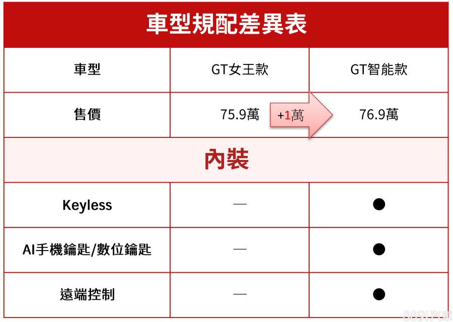 GT智能款車如其名,1萬換得Smart Key系統、Luxgen LINK⁺智聯網系統,透過Keyless、手機遠端控制、手機鑰匙等功能的追加,增添便利性與一絲如豪華車擁有的配備感受,端看個人使用習慣,畢竟有些人認為Keyless再實用不過~「反正加1萬,可以喔~」。