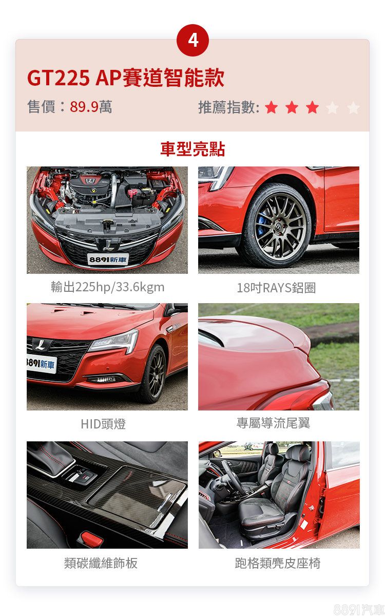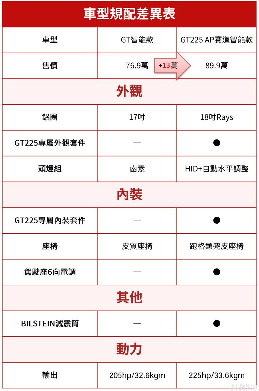 就車系整體選擇而言,最實惠者推薦的是二階的GT女王款,雖說入門作為代步已很夠用,配備也屬完善,但在全系主動安全較缺乏的前提下,GT女王款的AR View+系統還是能有助於提升行車安全,至於S5 GT225,就真的是較適合特定族群:那些受限於預算,血液裡卻又流竄著性能因子的準買家。