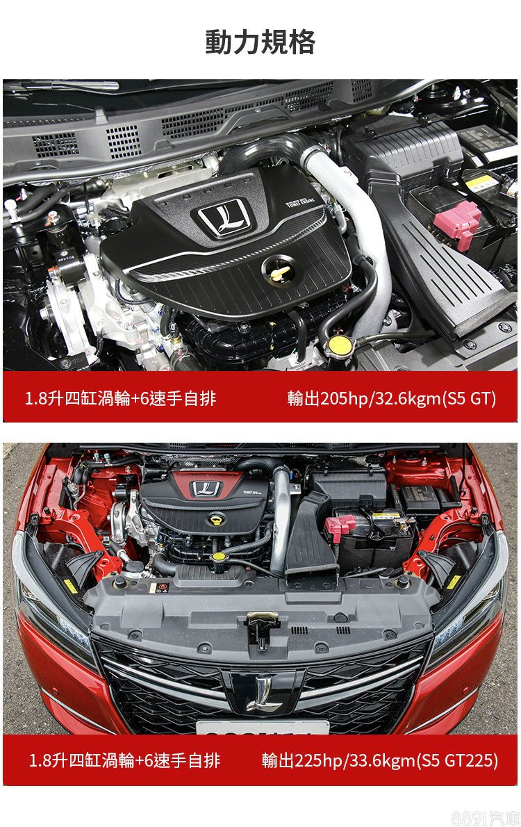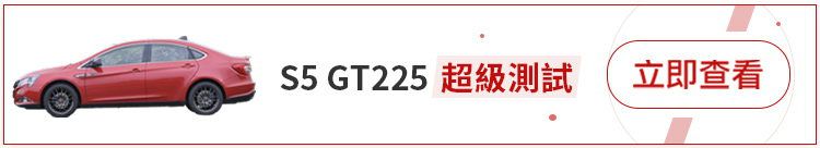 S5 GT/GT225均搭載1.8升四缸渦輪引擎,搭配6速手自排變速箱,最大出力分別為205hp/32.6kgm、225hp/33.6kgm,後者追加Bilstein減震筒之配置、摩擦係數更高的剎車來令片,前懸吊幾何角度也經過調整,不過未如U6 GT220降了10mm的車高,但經我們試駕後,確實對S5 GT225的性能輸出、加速表現持肯定態度,可惜由於配置普利司通T001的輪胎,影響側向抓地力表現。