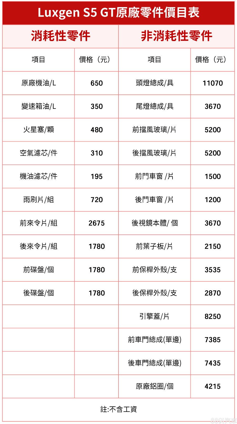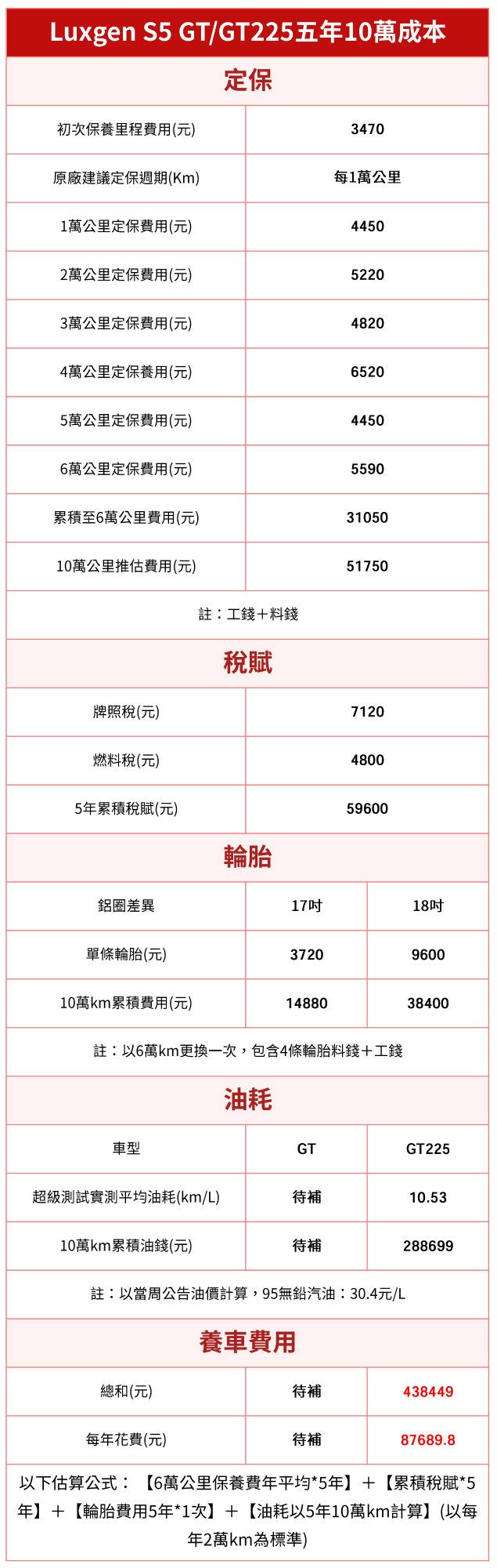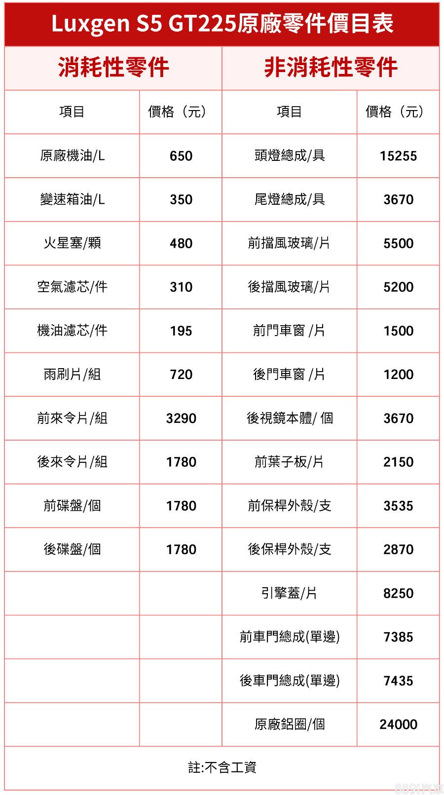 S5 GT/GT225在原廠保養部分,相比熱門的日系品牌,如雙田,在價格上並無優勢,不過倒也稱不上貴,大概為「中庸」表現;至於零件部分,多數定價都相當「平易近人」,由於GT225配備與設定的不同,在頭燈、前來令片,以及鋁圈上,有著最較明顯的落差,其中又以鋁圈為最(畢竟是RAYS的嘛~)!我們也針對GT225進行過油耗實測(<<點下去就對了),列舉出詳細的5年10萬公里養車成本,其他車型也有資料提供參考。