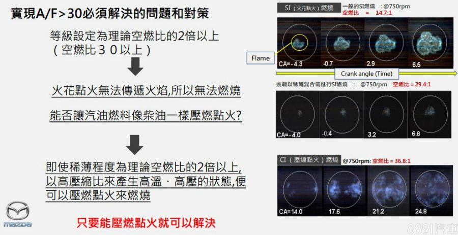 只要是壓燃技術,無論是HCCI或是馬自達獨創的SPCCI,油氣燃燒效率都遠優於傳統火星塞點火(SI:Spark Ignition),同樣是燃燒的工作,火星塞點火後,火焰燃燒需要時間擴散,但油氣自燃則是同時間全面性,可將其視為爆炸,威力自然比燃燒強大,因此能獲得更大動能,既然如此,也就可以減少同時間的燃油量,達到稀薄燃燒,混和比可達40:1的超稀薄燃燒境界,油耗表現自然得以減少。