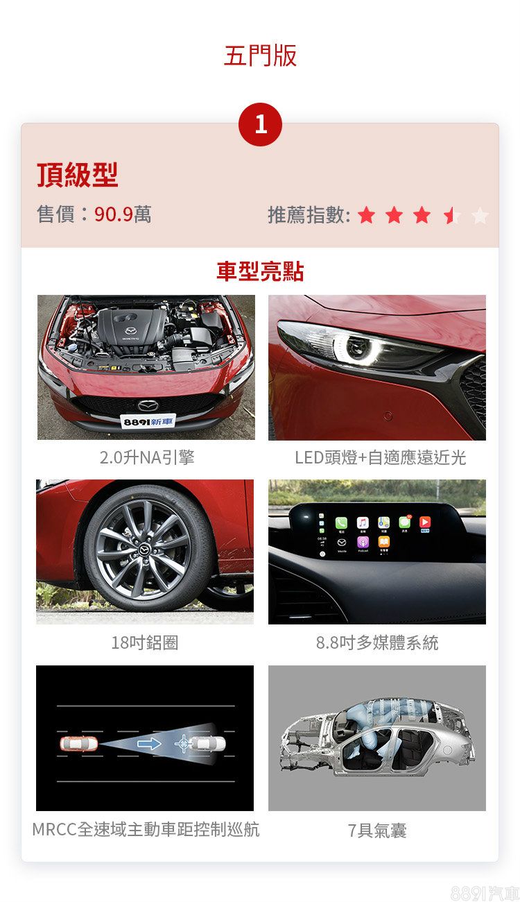 先撇除原廠針對新車各項細節的「斤斤計較」,畢竟那需要親身體會,別人說在多都沒用,不過光在視覺上,確實就能感受到新Mazda3內外質感的精進,更實際一點來說,當你有意入主時,配備自然重要,無論四、五門版本,都需至旗艦型,才能完整擁有大改款「更新」的項目,如全速域MRCC、CTS巡航模式車道維持輔助等,加上不變的「安全無價」原則,自然最推旗艦型!