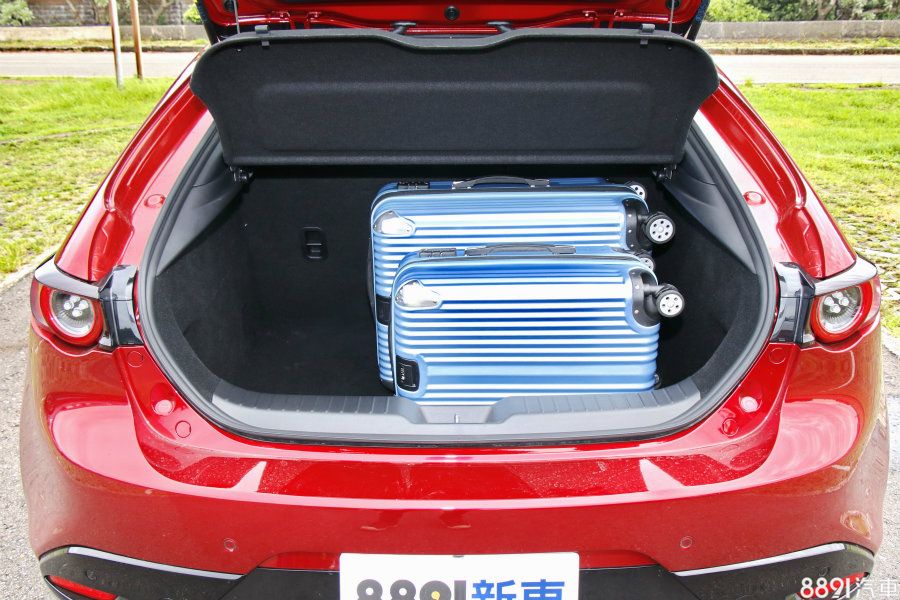 Mazda3行李廂儘管不是特別開闊,但對應四人出遊的行李倒也沒有不足之處,內部造型工整且足夠平坦;發揮五門掀背車款優勢,椅背傾倒後便能輕易容納大型物品,機能性充足。20吋、26吋行李箱雖然無法直立擺放,倒置高度卻也低於行李廂障版,不致影響後方視野。