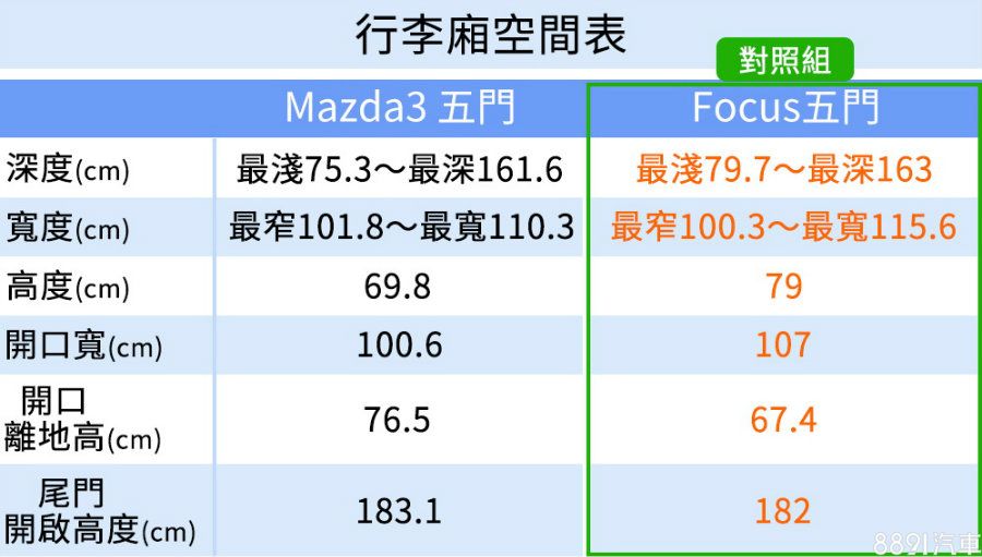 與同級對手Focus相較,Mazda3前座各項空間數據皆以為幅差距落後,僅有駕駛座腿部調整範圍在伯仲之間,然而細看數據差異、落差皆在1~2cm之內,老實說並不影響實際乘坐舒適度,符合一輛中型掀背車應有的空間表現。