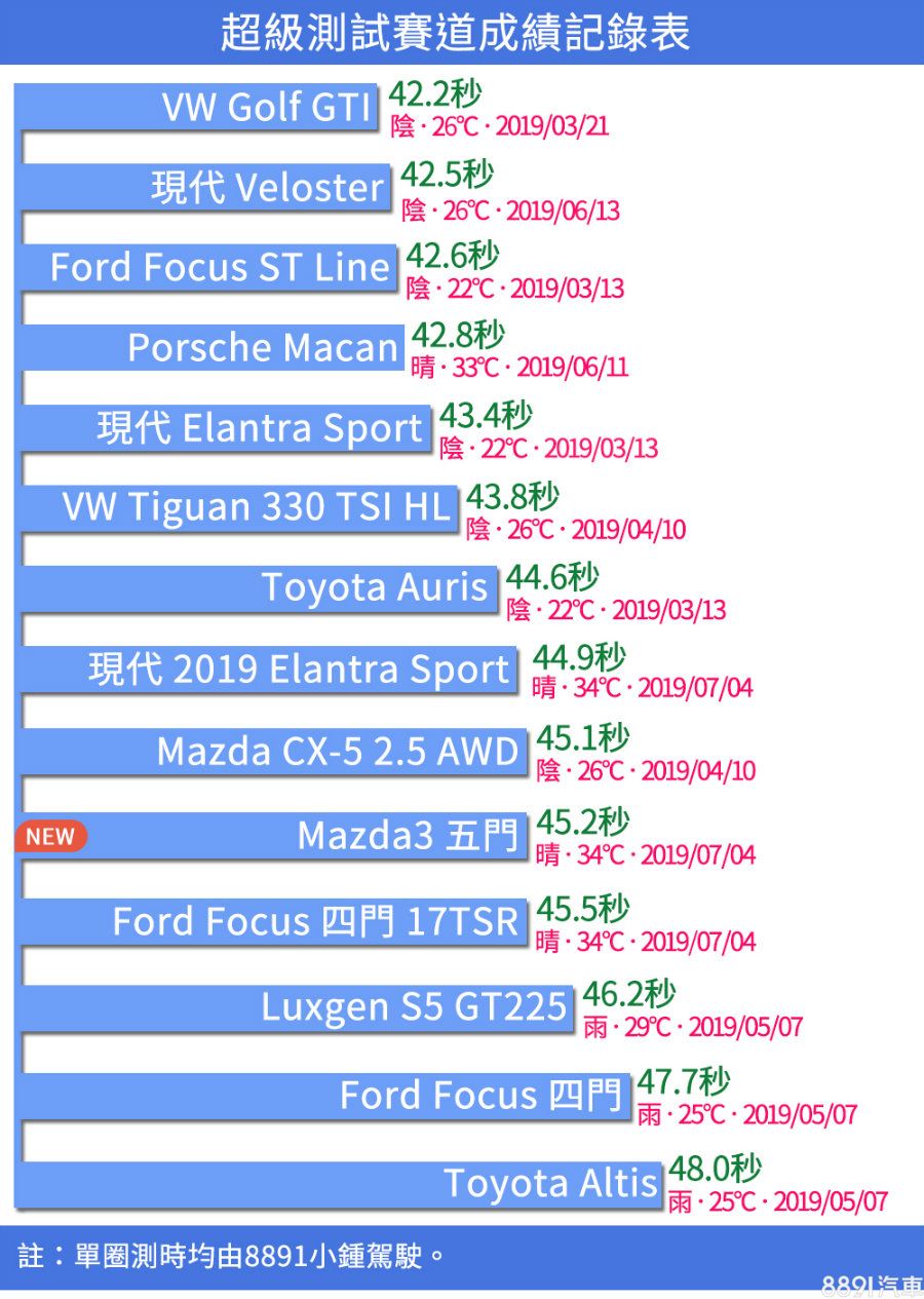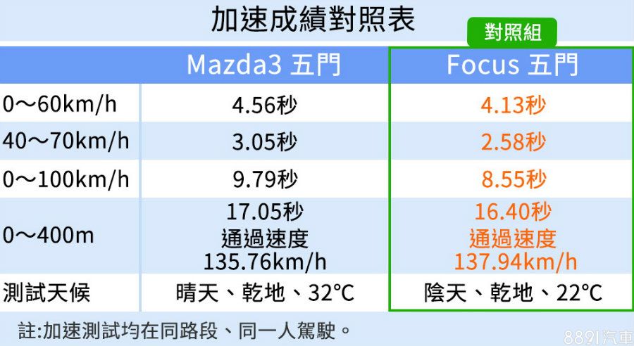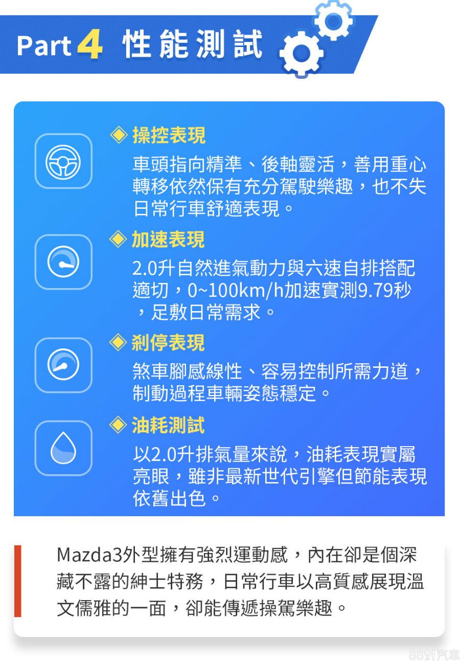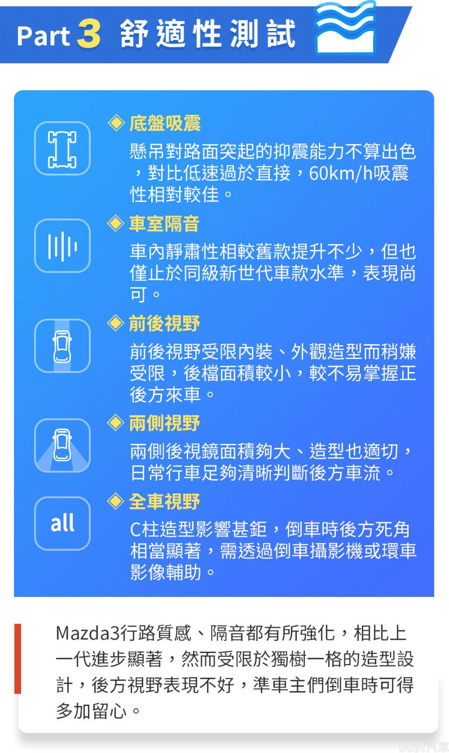由內而外,Mazda3都有逼近高級品牌的質感,同級對手這方面望其項背,但回到超級測試數據說話的初衷,我們並不認為他是輛性能取向的鋼砲,美型、有運動感的五門掀背應該更貼切,這部份和改成非獨立式後懸吊沒關係,新Mazda3仍然有靈活、服貼的動態表現,和前代採用後多連桿設計相比毫不遜色,但延續2.0升自然進氣+6速手自排配置,便出現底盤優於動力的現象,加上改成舒適取向的配胎,讓性能部分的實測成績均低於對照組Focus ST-Line,另一方面,Mazda3在靜態測試也沒發揮太大優勢,尤其空間還是一大罩門,如果你還年輕沒有家庭包袱,買車非常重視設計感,選Mazda3沒錯!