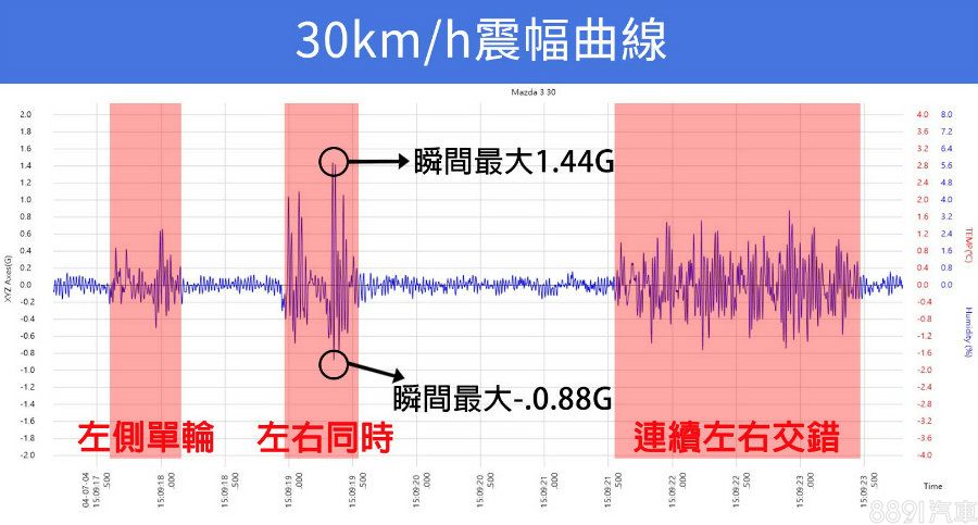 2.震動計算起點統一:起始點為前輪壓到第一根減速條,震動儀產生G值開始計算。後輪壓到最後一根減震條、震動回復近於0時為計算終了。在車速一致、計算起終點都相同之下,所測得的震動數據即可橫向對比。
