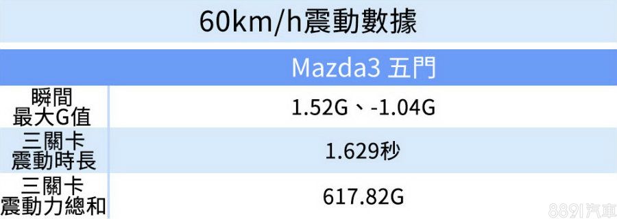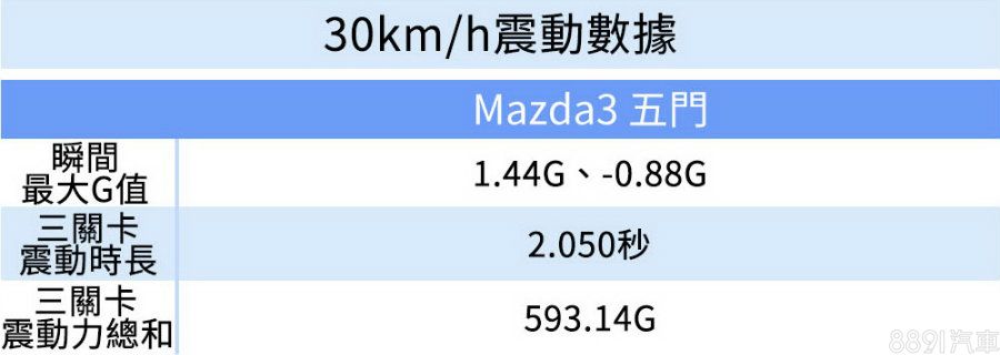 低速狀態下Mazda3對應路面突起的處理能力並不出色,在底盤設定相對軟調的前提下,G力總和與震動時長兩項數據表現都不佳,阻尼抑震效果較不足;參考正向最大G值來到1.44G、相對負G值僅0.88G,看得出原廠刻意針對坑洞處理加以強化,並希望能兼顧低速行路質感,然而如此底盤設定並不善於對應我們以路面突起為主的震動測試關卡。