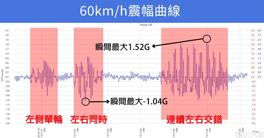 車速提升至60km/h,震幅曲線走向同樣稍嫌雜亂,並無法有效吸收連續左右交錯關卡所產生的震盪,但最大G值並未隨著車速提升而顯著增加,代表懸吊設定足以對應車速提高所產生的額外震盪,整體舒適度並未因車速提高而下滑。