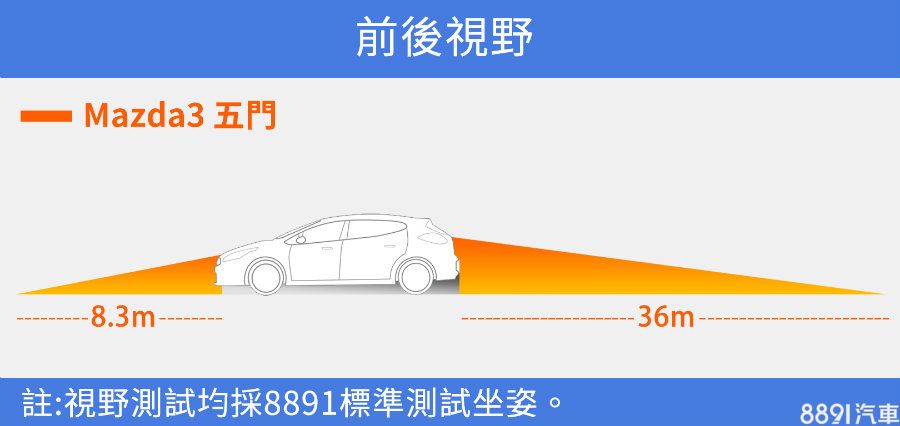 Mazda3強調給予駕駛人強烈包覆感,儀錶與出風口設計相對高聳,對於前方視野稍有影響;後方則受限於車尾造型,後檔傾斜且面積狹小,兩側C柱造型寬厚,讓後方視野相對受限。