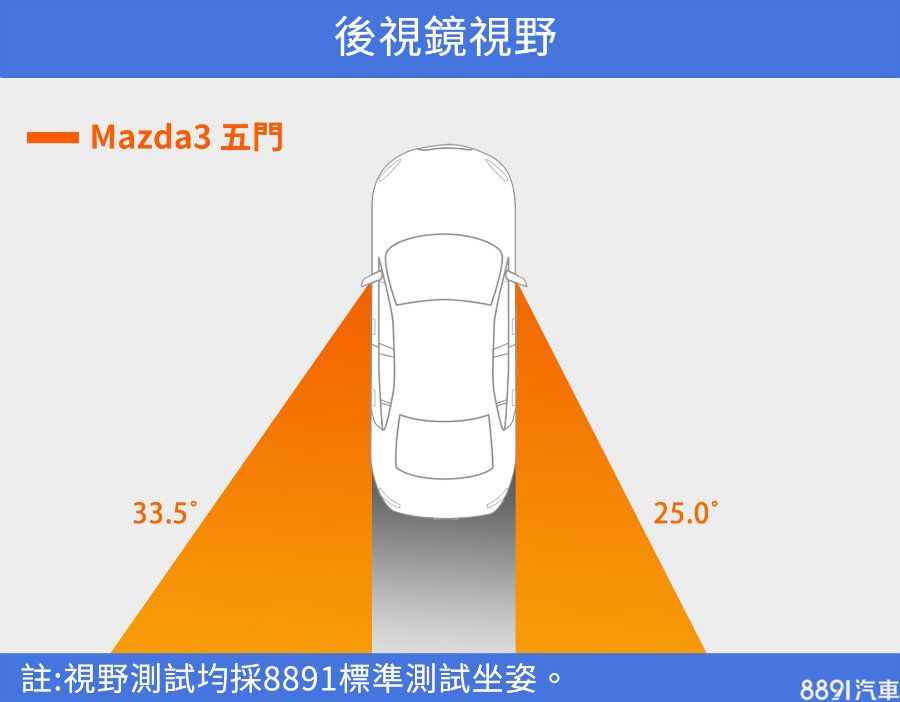 Mazda3後視鏡造型經過重新設計,與舊款並不相同,鏡面雖無外緣廣角設計,但鏡面方正、照射面積充足,不論左右後視鏡都能充分掌握車流狀況。