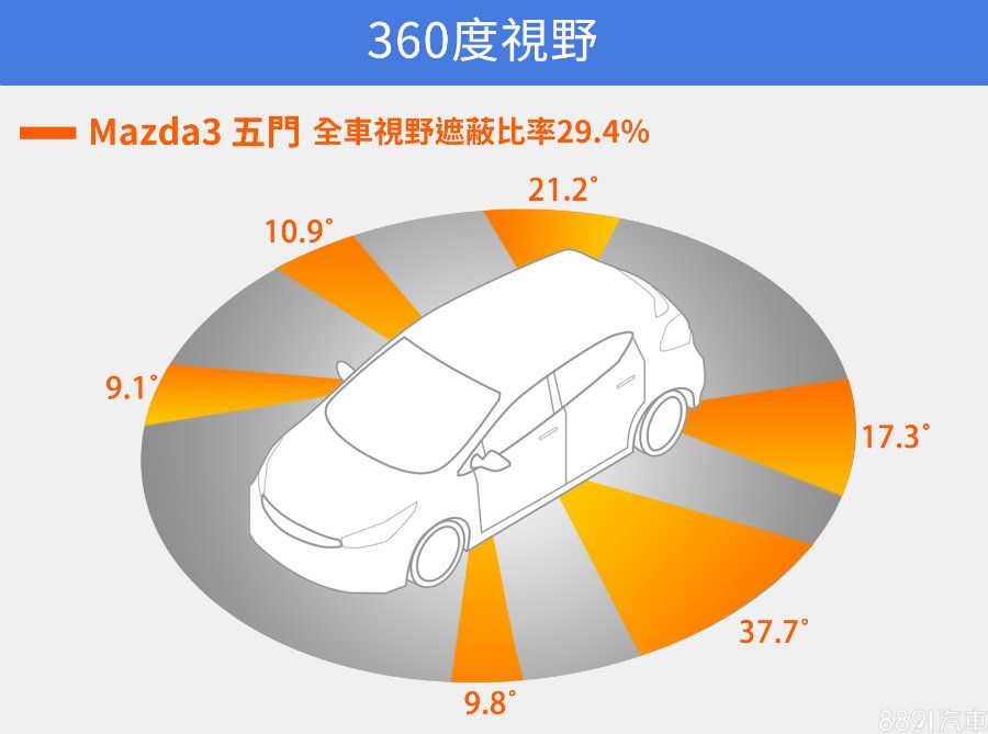 Mazda3五門版向來針對外型掀起激烈討論,寬厚C柱雖然是其視覺重點,但對於視野的影響卻也相當顯著,實際進行測量,A柱、B柱遮擋角度都在合理範圍內,唯有後方C柱遮擋角度顯著較大,也讓全車視野遮蔽率來到29.4%。