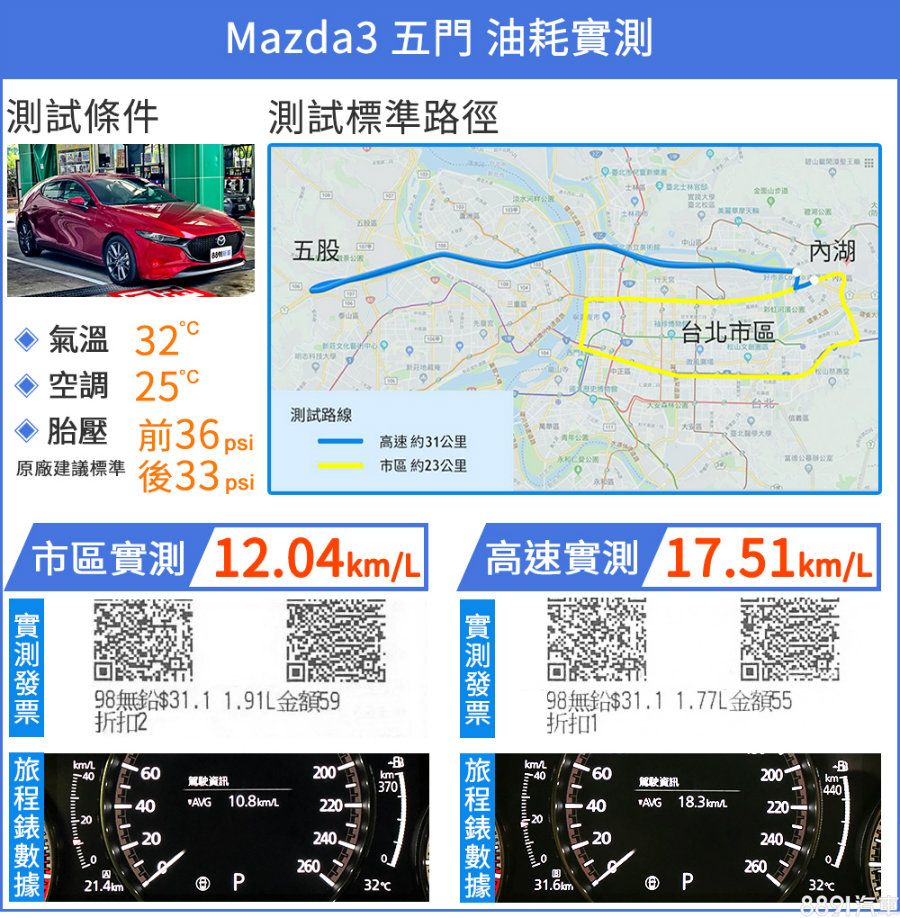 Mazda3雖然在動力方面並未更新,維持相同2.0升自然進氣引擎與六速手自排變速箱,但節能表現一直以來都相當亮眼,油耗實測過程中車流大致順暢,讓Mazda3繳出市區12.04km/L、高速17.51km/L的優異成績,並不遜於小排量、搭配CVT或DCT變速箱的同級車款,以2.0升排量來說實屬難得。