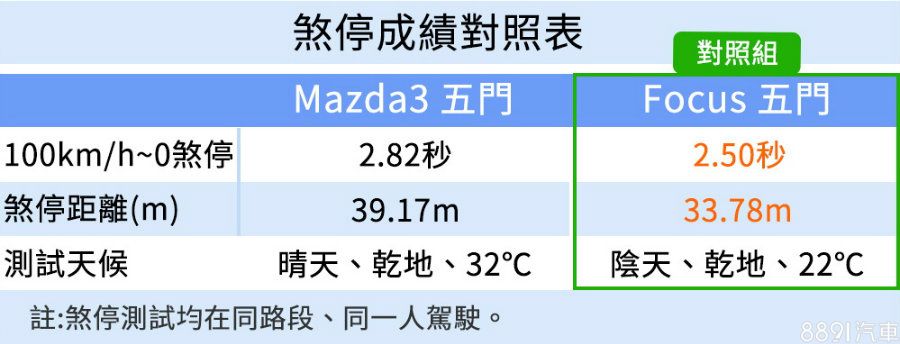 Mazda3在時速100km/h重煞至靜止的穩定度佳,方向盤沒有多餘拉扯,但檢視數據,所需的煞停距離偏長,如果和Focus ST-Line相比更有段差距,但Mazda3的輪胎等級與胎寬在性能上都比較弱勢,結果不令人意外。
