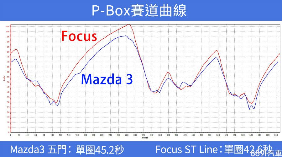 將兩車P Box速度曲線相疊,可以清楚看出Focus ST Line動力佔有明顯優勢,235mm的PS4跑胎對於彎中速度也有一定幫助,縱使馬3有著靈活車尾,部分彎角想嘗試藉由車尾滑動,縮短過彎時間,但T005無法給予前輪更多的抓地力之下,靈活後軸對縮短單圈時間的幫助有限。