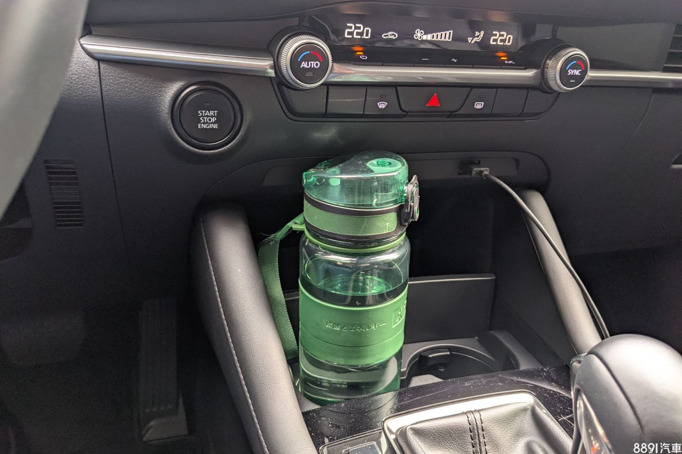 這次的前座置杯空間從排檔桿後方移至排檔桿前方,對於使用排檔桿不再受干擾,置杯空間一樣有夾緊功能,圖中為太X工房的700cc水壺,放進置杯架中不會卡到中控台,瓶身也剛好可以放滿,看來要放置一般的寶特瓶與手搖杯都是沒問題的。