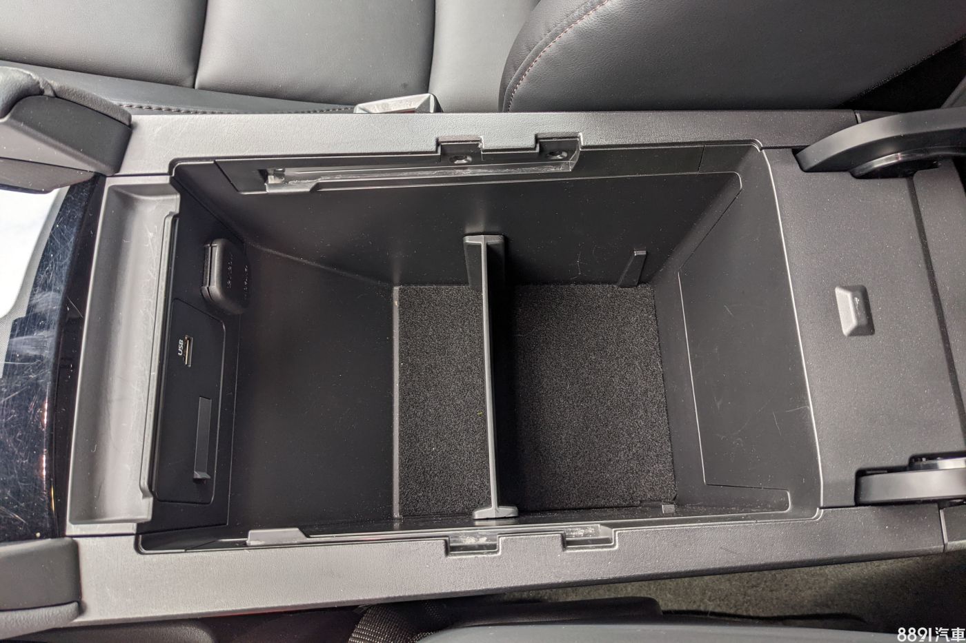 中央扶手打開後,提供一個12V電源與USB Type-A插槽,而底部也有絨布包覆可減少異音,若將隔板移置後方,要放進一顆高麗菜應該也是小菜一疊。