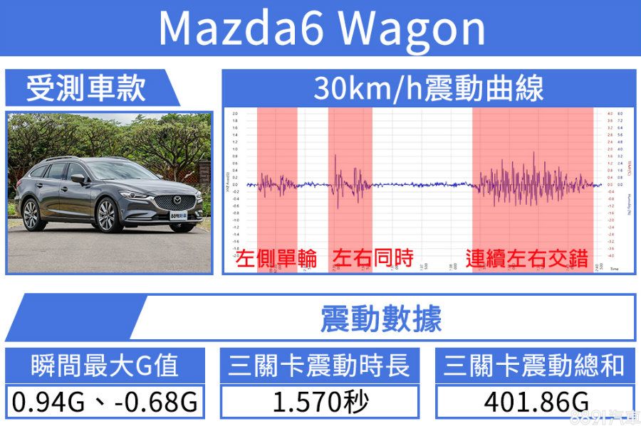 對比其他兩車,Mazda6 Wagon懸吊設定稍稍具有運動風格,避震器阻尼較為硬朗一些,但從震動曲線能看出設定仍是良好,連續左右關卡也能應付自如,沒有來不及吸收震盪的情況發生。最大G值與震動時長兩項指標參考過往超級測試經驗實屬前段班,只不過Mondeo Wagon與Passat Variant表現更為突出,因此Mazda6 Wagon在此次測試中稍稍被掩蓋光芒。