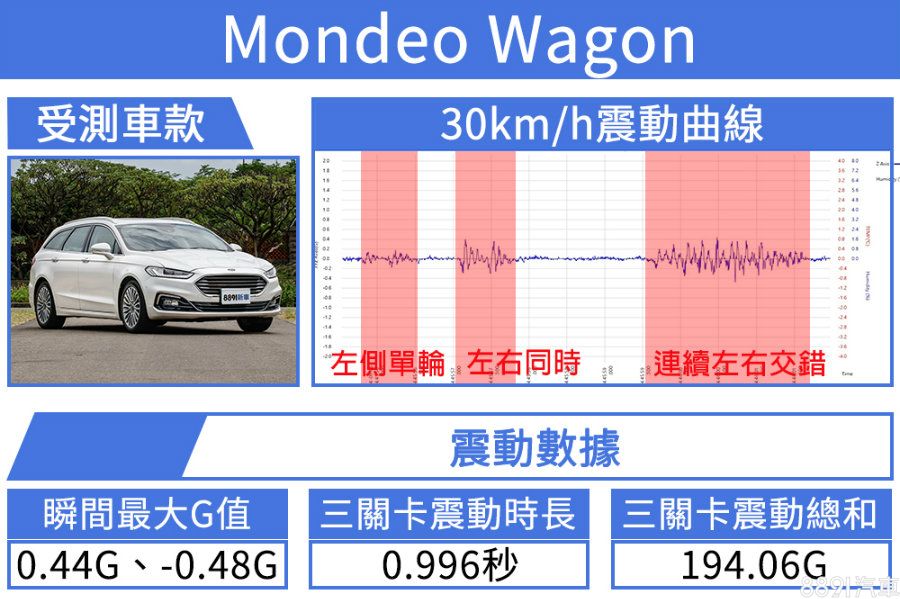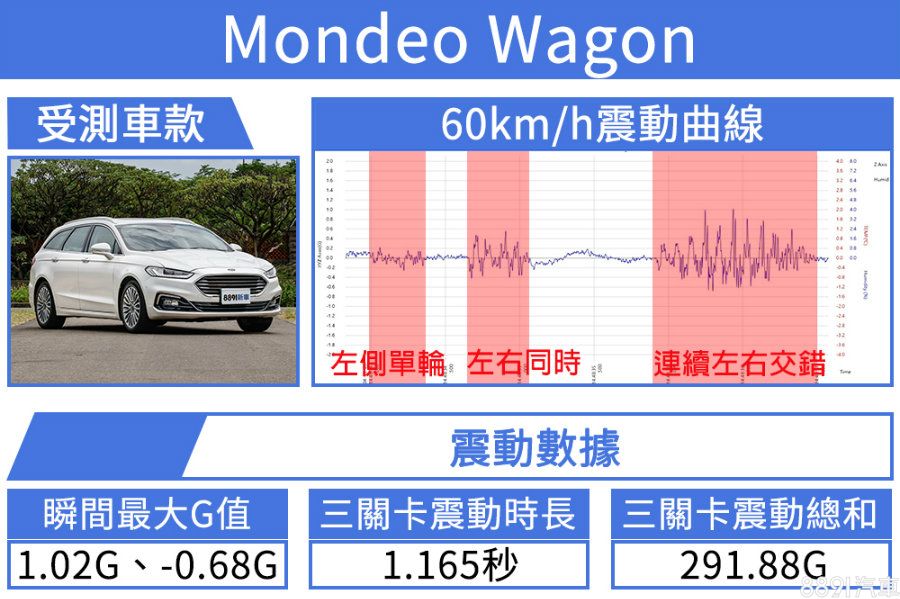同樣將CCD電子懸吊設定在舒適模式,Mondeo Wagon以60km/h通過測試陣仗,衝擊感同樣能有效被抑制,瞬間最大G值顯著小於另外兩車,震動時長也較短,代表車身快速回復平穩,如履平地般營造舒適乘坐感。以60km/h通過測試陣仗,震動總和僅291.88G,同樣是過往超級測試中表現最出色的車款!