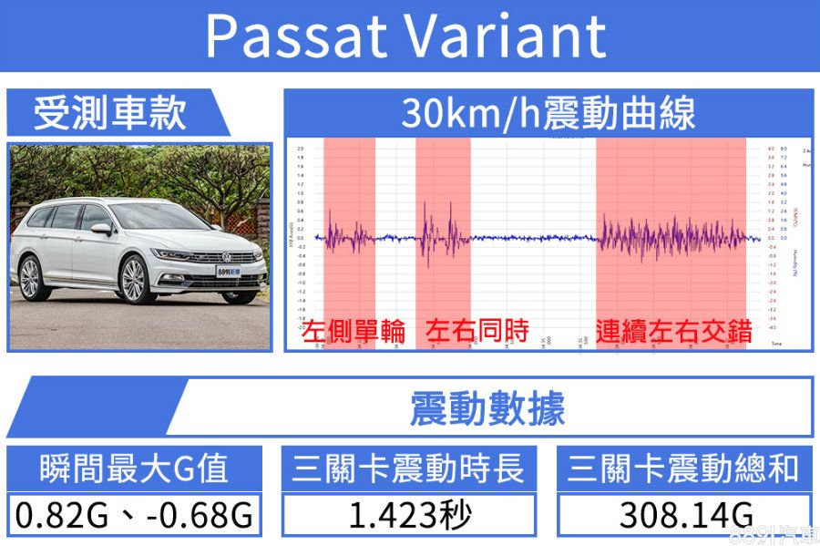 Passat Variant與Mazda6 Wagon相同採傳統簧圈懸吊、沒有電子阻尼配置,但紮實車體與歐系懸吊設定讓乘坐感受相較Mazda6更為俐落,通過測試陣仗、最大G值與Mazda6相仿,但震動時長與震動力總和卻是顯著低於Mazda6,代表阻尼設定更為優異,能快速吸收碎震令車輛回復平穩,底盤調校功力更上一層樓,只不過整體表現仍不如配有連續可變阻尼的Mondeo Wagon。
