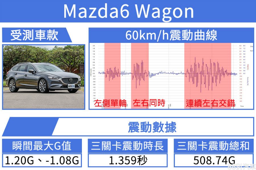 隨車速提高到60km/h,Mazda6 Wagon舒適度並未顯著降低,雖然最大G值稍稍突破1G,衝擊感稍明顯一點,但車身能很快回復平穩,沒有過多二次晃動的情形,整體來說,舒適度沒有不足之處。只不過Mondeo Wagon與Passat Variant表現實在過於出色,突顯Mazda6 Wagon在底盤調校方面著實還有些許進步空間。