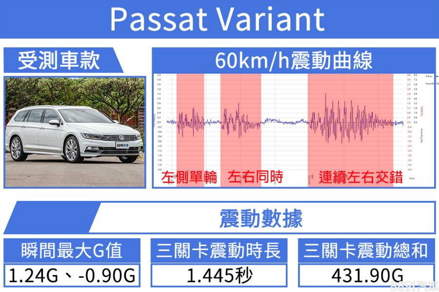 Passat Variant在低速測試中擁有顯著優於Mazda6的表現,但在60km/h測試中,便沒有那麼突出,瞬間最大G值雖然略小於Mazda6,但隨車速提高、阻尼開始出現來不及吸收震盪,導致連續左右關卡震動曲線雜亂的情況產生,穩定度略受影響。只不過整體而言Passat Variant舒適度仍屬優異,而與Mazda6在伯仲之間。
