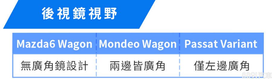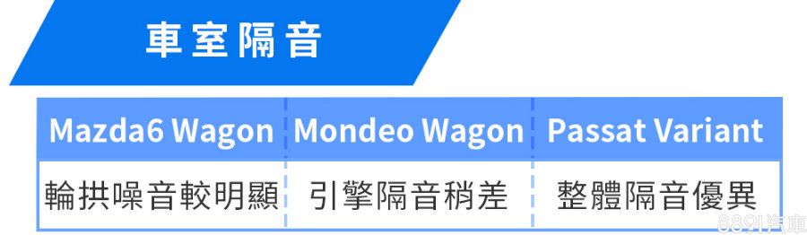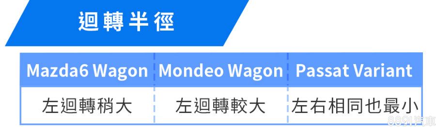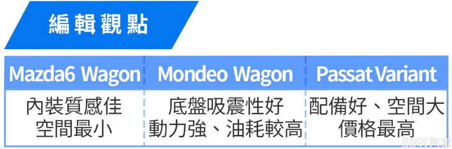Mazda6 Wagon是以2.5升版本出戰,132.9萬價格與Mondeo Wagon一樣,兩車競爭味極濃!至於Passat Variant,最近調整編成,只留330TSI R-Line一款,雖然與另外兩車同級距,動力也相仿,但價格硬是高上一截,40萬價差相當驚人,這價差是否能反應到實際表現?讓人相當好奇!