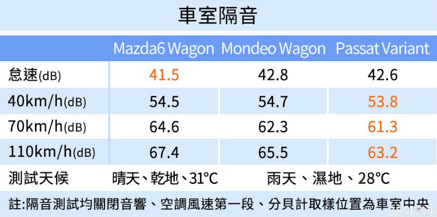 須說明的是,因測試流程受天氣影響之故, Mazda6 Wagon測試為乾地,Mondeo Wagon與Passat Variant則是溼地測試,因此Mazda6 Wagon數據無法與另外兩車橫向比較,特此說明,之後我們會再商借Mondeo Wagon與Passat Variant補測乾地數據,讓三車噪音測試可以有橫向比較的價值!