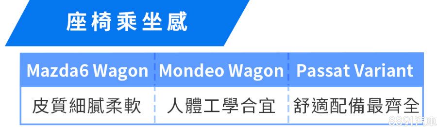 從數據來看,Mazda6 Wagon前座空間是三車最平凡者,Mondeo Wagon車室橫向最寬,駕駛腿部可伸展、調整的空間也較大;Passat Variant則是椅面長度、頭部空間勝出,椅墊長度可調整的設計,是三車獨有,甚至駕駛座還有按摩功能!