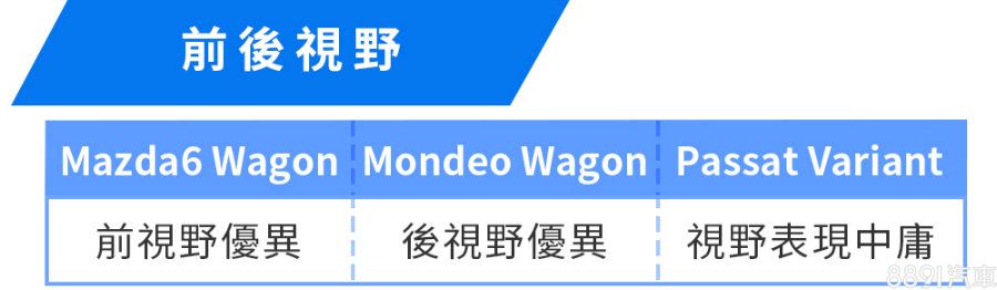 Mazda6外觀流線,但仰賴較短的中控台設計,前視野比對手優異有感;後視野則為Mondeo最好,主因在於尾窗大片之外、腰線也特別低,比同級少了近8m的距離。